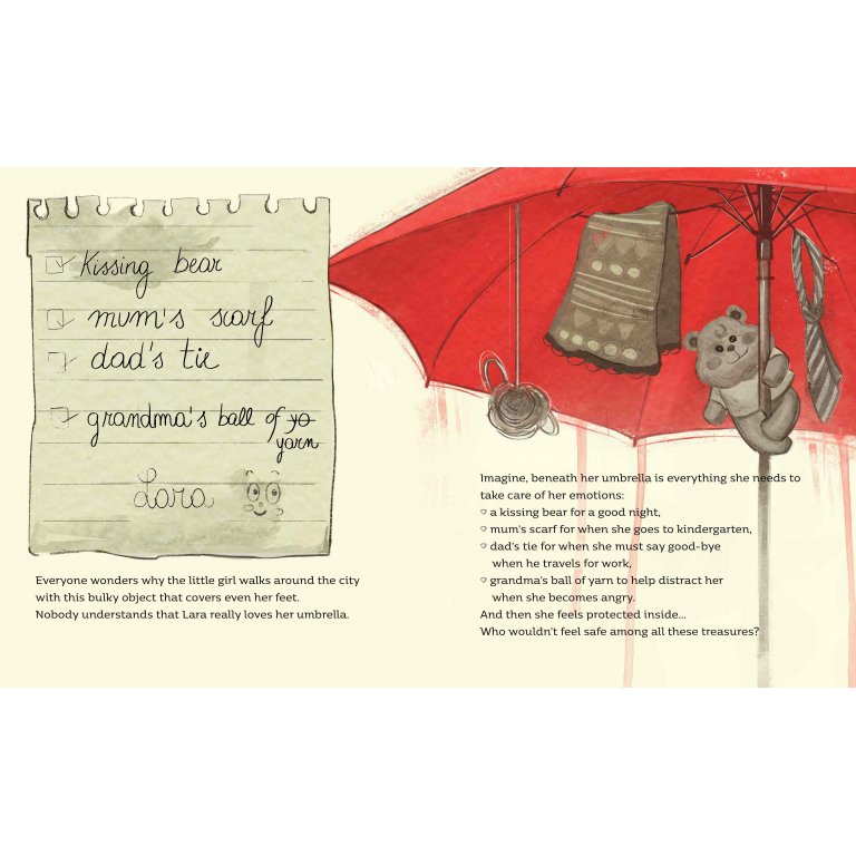 Una storia dolce e delicata sull’abbandono degli oggetti che accompagnano i bambini durante la crescita. Lara è una bambina molto timida. Così timida che per uscire di casa si nasconde sotto un grande ombrello, da cui non si separa mai. A Lara, però, manca davvero molto poter giocare liberamente. Così, un giorno, prova in tutti i modi a sbarazzarsene. Il libro è composto da 32 pagine ed è in inglese. Casa editrice Sassi Junior.