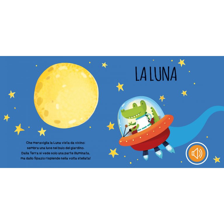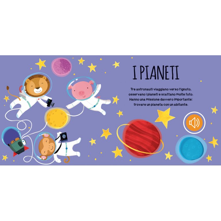 Leggi le avventure dei simpatici animali nello Spazio, premi i pulsanti e impara a riconoscere i loro versi. Muovi su e giù la maniglia: sentirai il suono di un radar spaziale che ti accompagnerà durante la lettura!