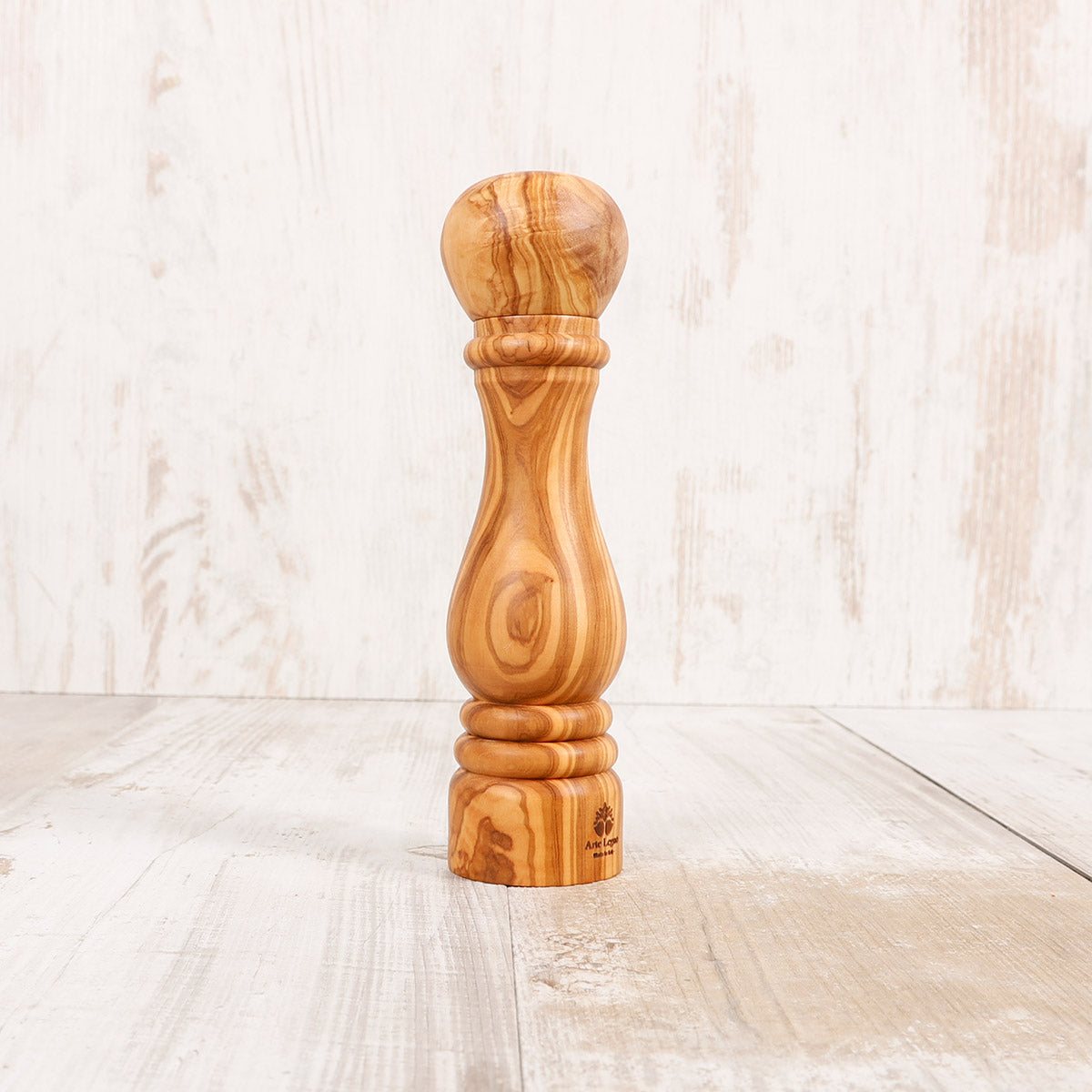 Macina sale e pepe in legno di ulivo. Il prodotto è artigianale, in legno naturale e lavorato a mano. L'oggetto presenterà lievi differenze in forma, dimensioni, sfumature e venature del legno, a garanzia della sua unicità. Dimensioni 5,5x21cm circa. Realizzato da Arte Legno Spello SRL, made in Italy.