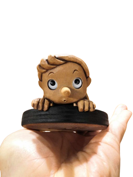 Pinocchio curioso, affacciato oltre la base. Il Pinocchio si sviluppa in lunghezza e sporge leggermente oltre la base che è di 10cm.