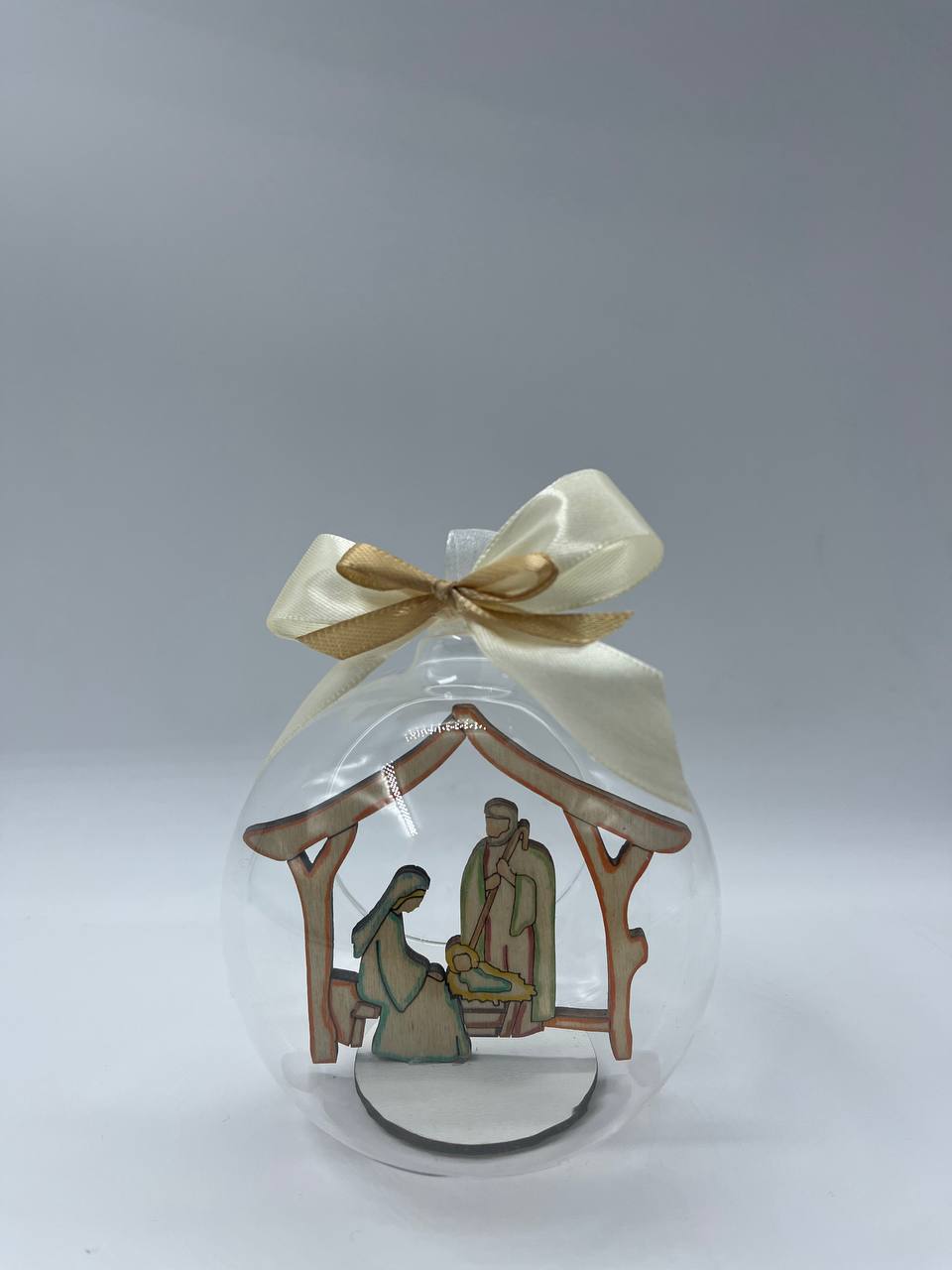 Sfera natalizia in vetro, diametro 10cm. L'interno è realizzato in pioppo, con intaglio laser e dipinto a mano. Lievi differenze dall'oggetto in foto garantiscono l'unicità del prodotto. Il colore del fiocco potrebbe essere diverso da quello in foto. Realizzazione artigianale ABS Oggettistica, made in Italy.