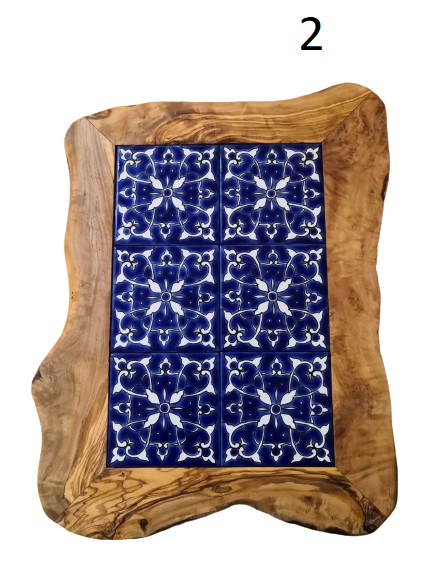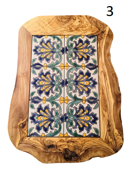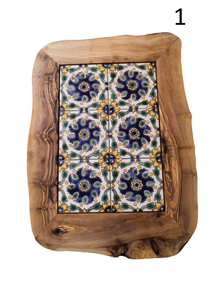Vassoio in legno di ulivo e 6 mattonelle in ceramica. Il prodotto è artigianale, in legno naturale e lavorato a mano. L'oggetto presenterà lievi differenze in forma, dimensioni, sfumature e venature del legno, a garanzia della sua unicità. Dimensioni 40x30 circa. Realizzato da Arte Legno Spello SRL, made in Italy.