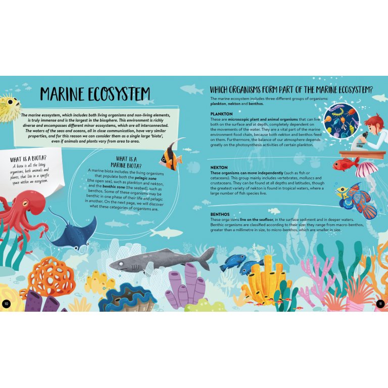 Questo libro della serie Cosa, come, perché esplora vari aspetti dei mari e degli oceani, risorsa fondamentale per la vita sulla Terra, attraverso la formula domanda-risposta. La Terra è in gran parte coperta di acqua: oceani, laghi e fiumi costituiscono il 71% della superficie terrestre, il che spiega perché, quando guardiamo il nostro Pianeta dallo Spazio, lo vediamo come una grande palla blu. Quando si sono formati gli oceani e i mari? Qual è la differenza tra mare e oceano? Quali organismi vivono nell’ecosistema marino? Il libro è in inglese, di 64 pagine. Casa editrice Sassi Junior.